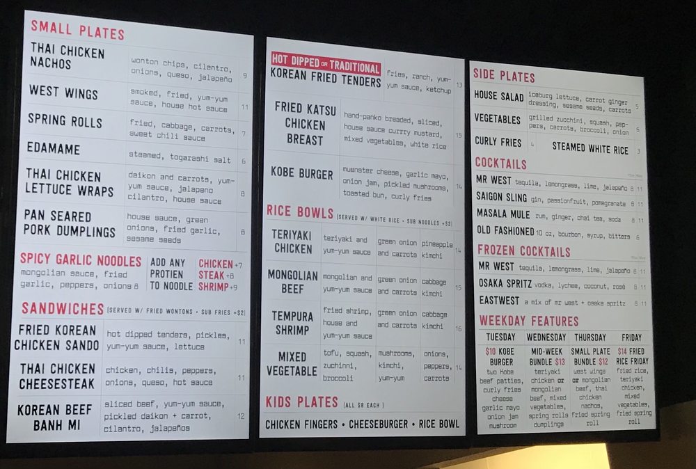 Welcome to Mr. West's Asian Kitchen, where an exciting fusion of Asian flavors meets the comfort of American cuisine in Trussville, AL. This vibrant eatery invites you to explore a menu that tantalizes the taste buds, starting with delectable small plates like the pan-seared pork dumplings and Thai chicken lettuce wraps, both priced at just $9.00. For those craving a heartier option, the Korean fried chicken tenders ($14) and Katsu fried chicken ($17) promise to satisfy. Don’t miss the steamed bao buns — the smoked pork belly and fried soft shell crab are standouts that carry an unforgettable flavor. Many satisfied customers rave about the delightful atmosphere and quick service, making Mr. West's not just a dining spot but a community gem. Experience Asian cuisine reimagined, and you won't be able to resist coming back for more.